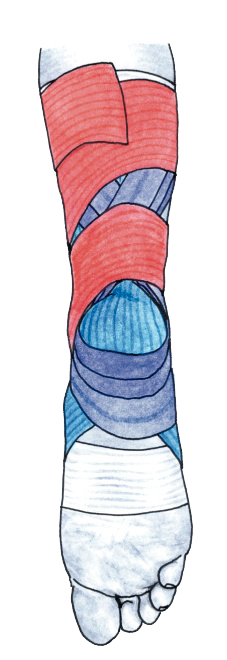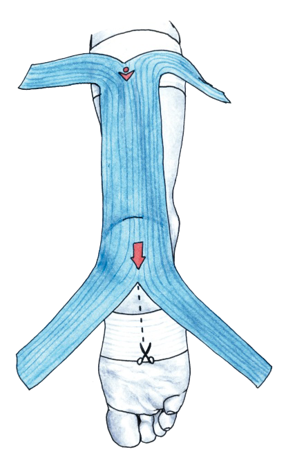 Pour renforcer la stabilisation externe, effectuez un verrouillage antérieur et postérieur de l’arrière pied avec Omnitape® 4 cm (jaune).