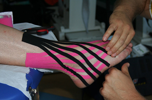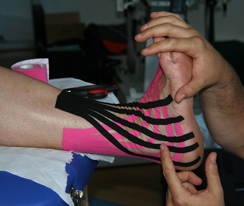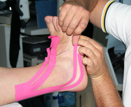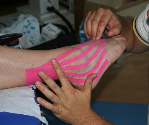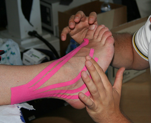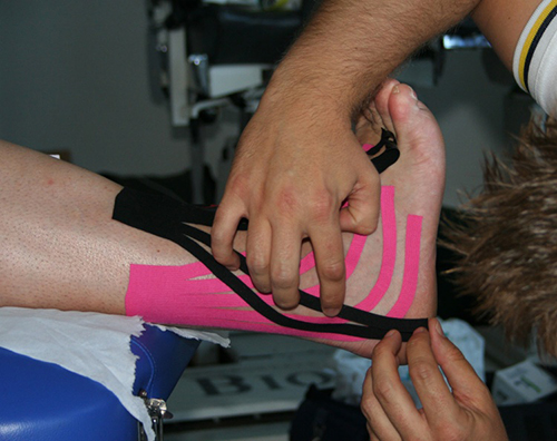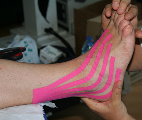Bandes antérieures Le pied est placé en flexion plantaire afin de positionner les bandes antérieures et d’obtenir des »plis » de bandes lors de la flexion dorsale. en Omnitape ® 4cm décalées de moitié.